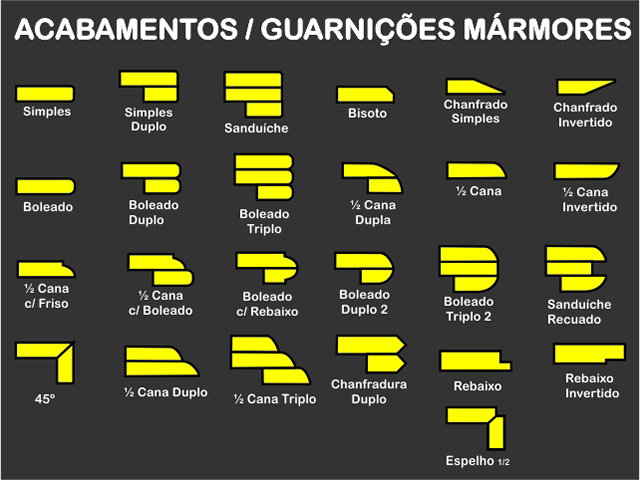 Acabamento Lateral - São os diversos modelos de acabamentos que são utilizados para trabalhar a borda das pedras, mais utilizados em pias, lavatórios, lavabo, mesas, aparadores, bancadas e etc.